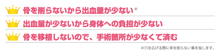 NY式インプラントとは、顎の骨の表面に小さな穴を空け、その穴をゆっくり広げていくことでインプラントを埋入可能にする治療法です。骨をほとんど削らないので、インプラントを支える骨を失うこともありません。骨を削るインプラントに比べて痛みや腫れも少ない治療です。